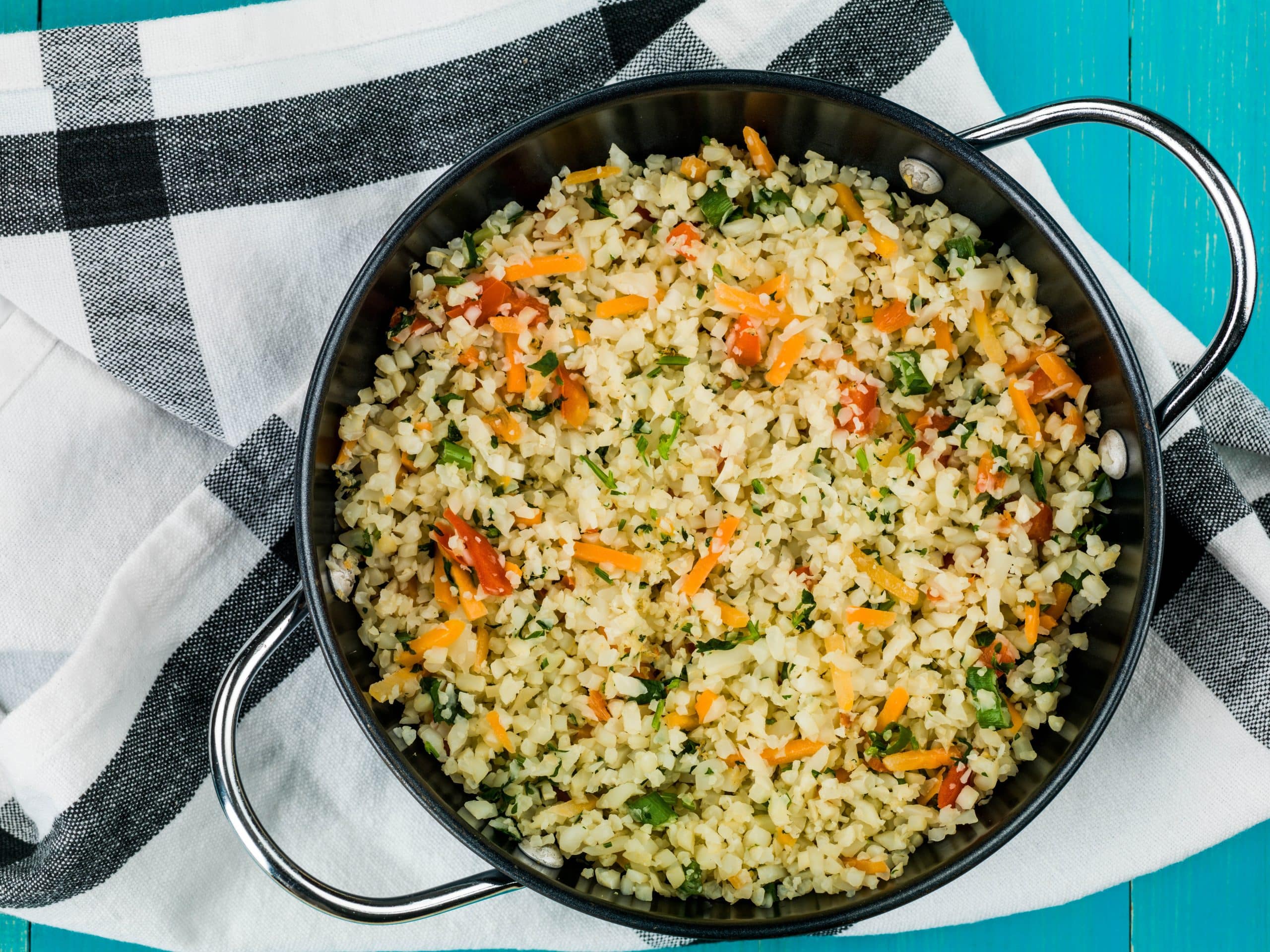 2.) Add cauliflower rice, ginger, and garlic and stir well to combine.