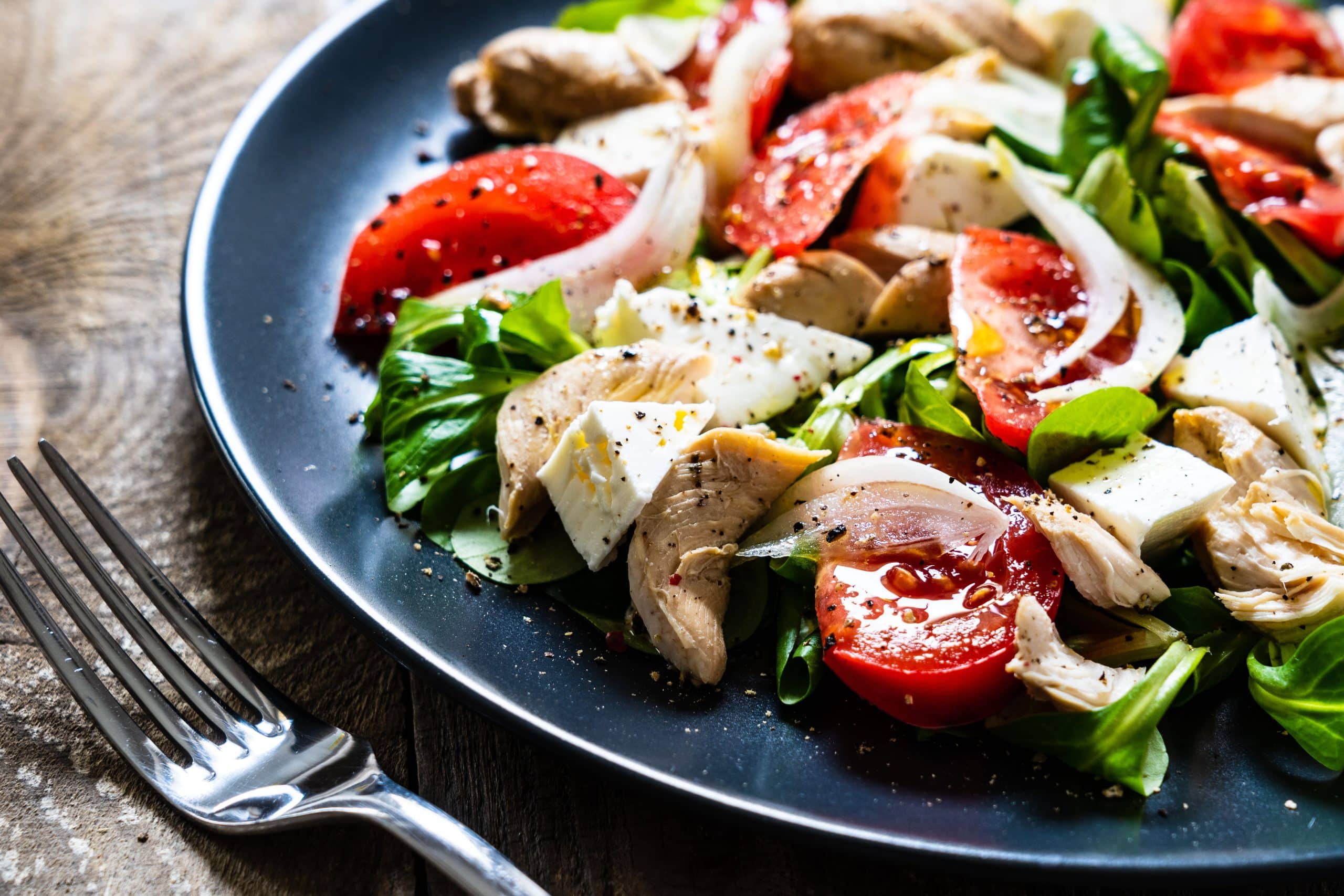 2.) Divide lettuce, cucumbers, tomatoes, avocado, and feta among four serving bowls. Top with sliced chicken.